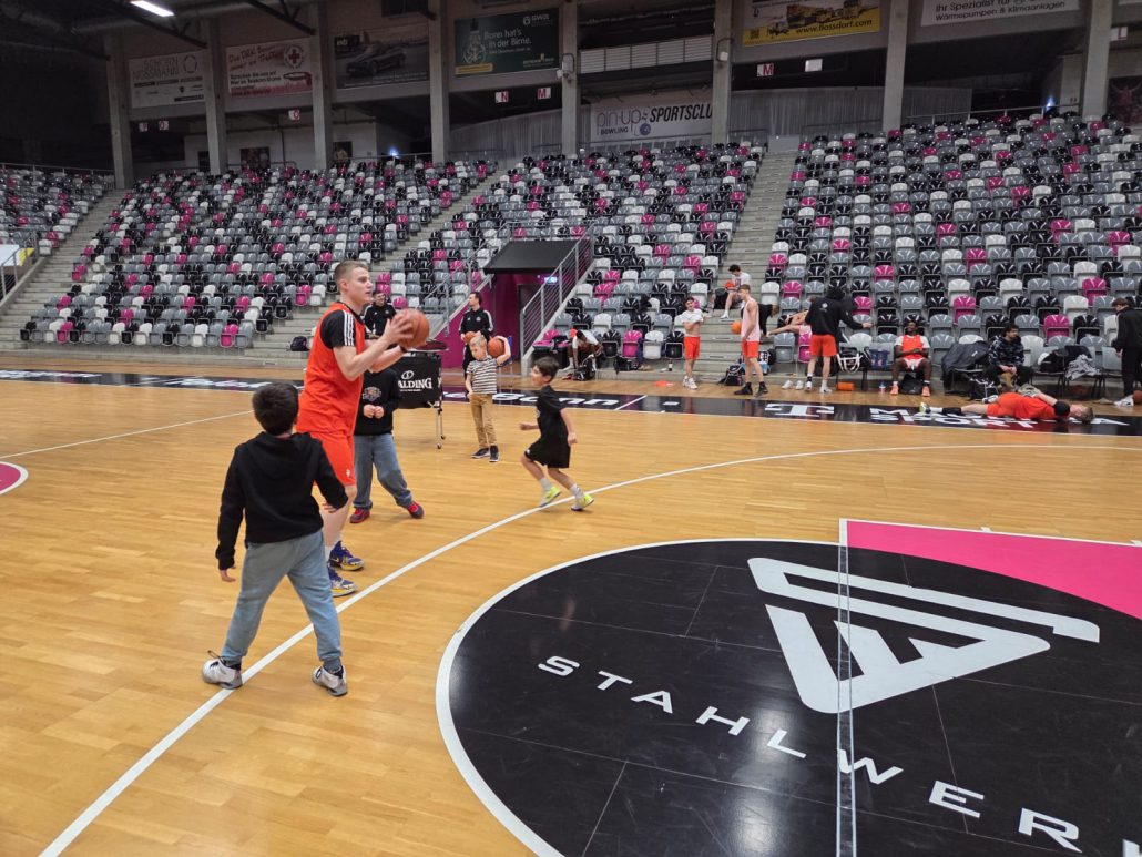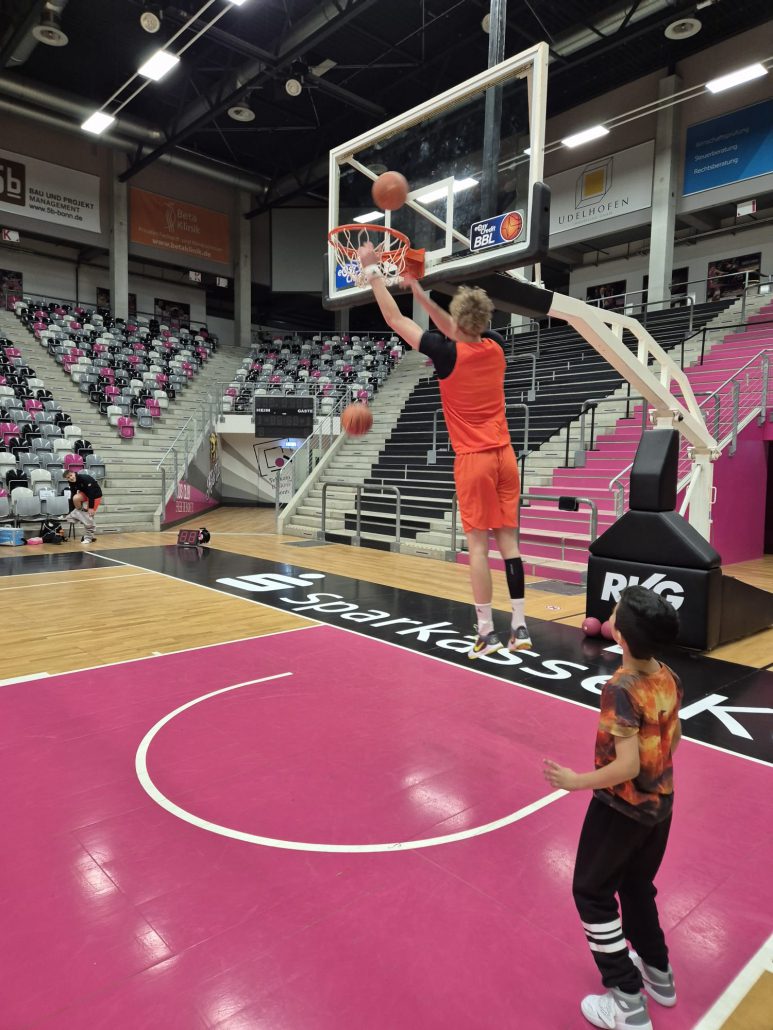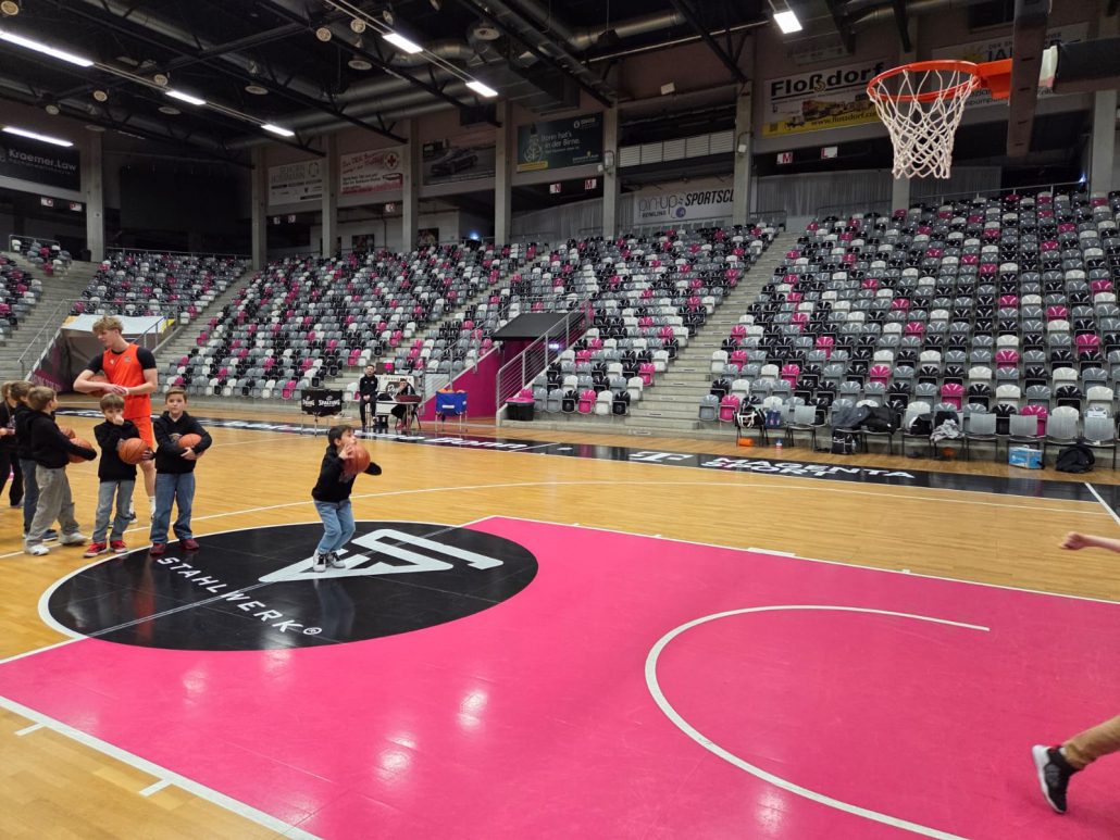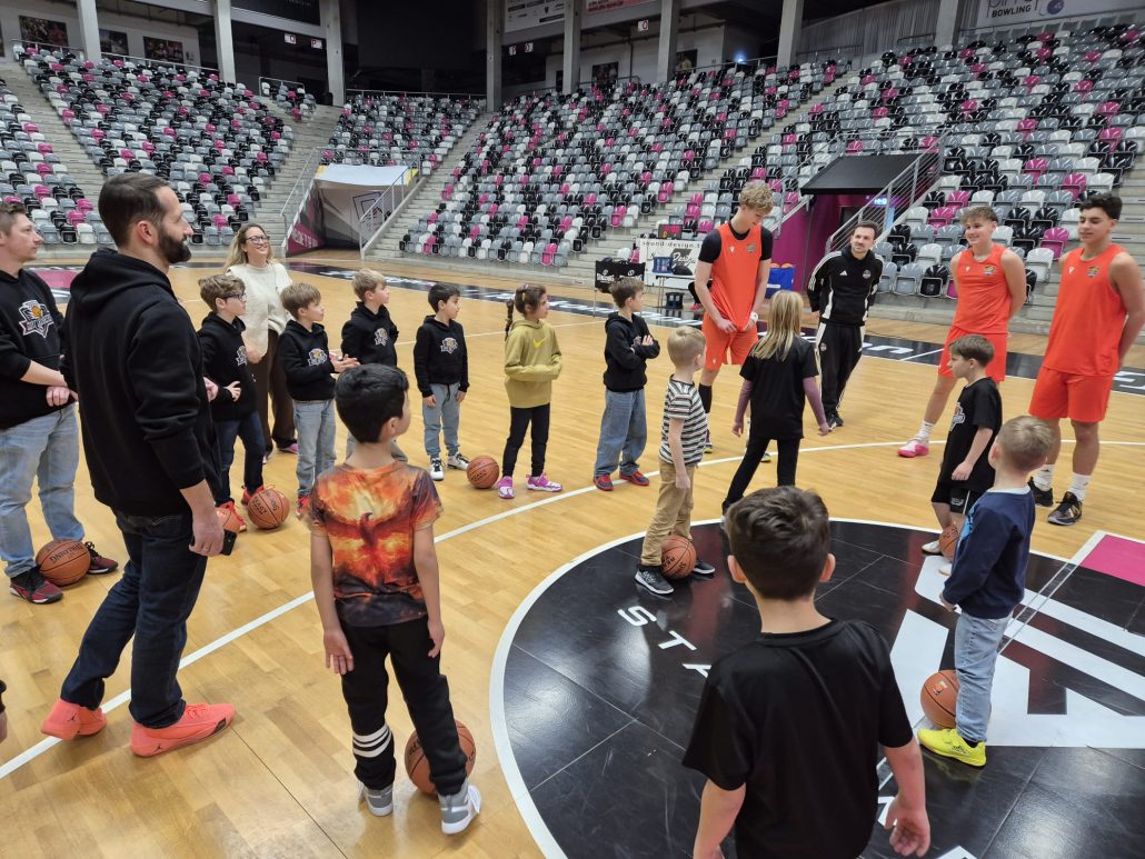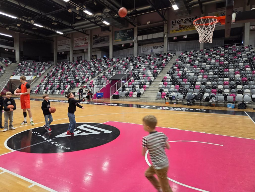 Das absolute Highlight folgte im Telekom Dome selbst: Auf dem Court der Profis zogen die Kinder ihre Basketballschuhe an und durften sich gemeinsam mit drei NBBL-Spielern messen. Im Anschluss verfolgten sie das Training der NBBL-Spieler und erlebten hautnah das Tempo und die Intensität auf höchstem Nachwuchsniveau.