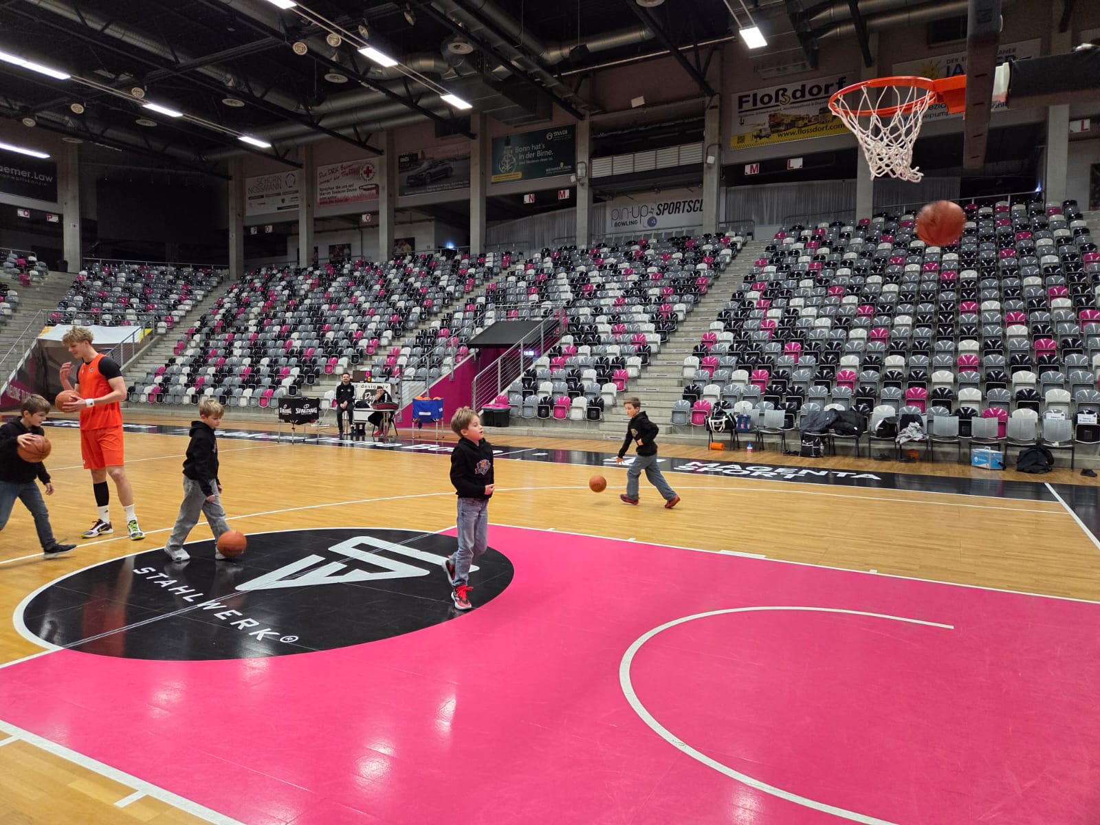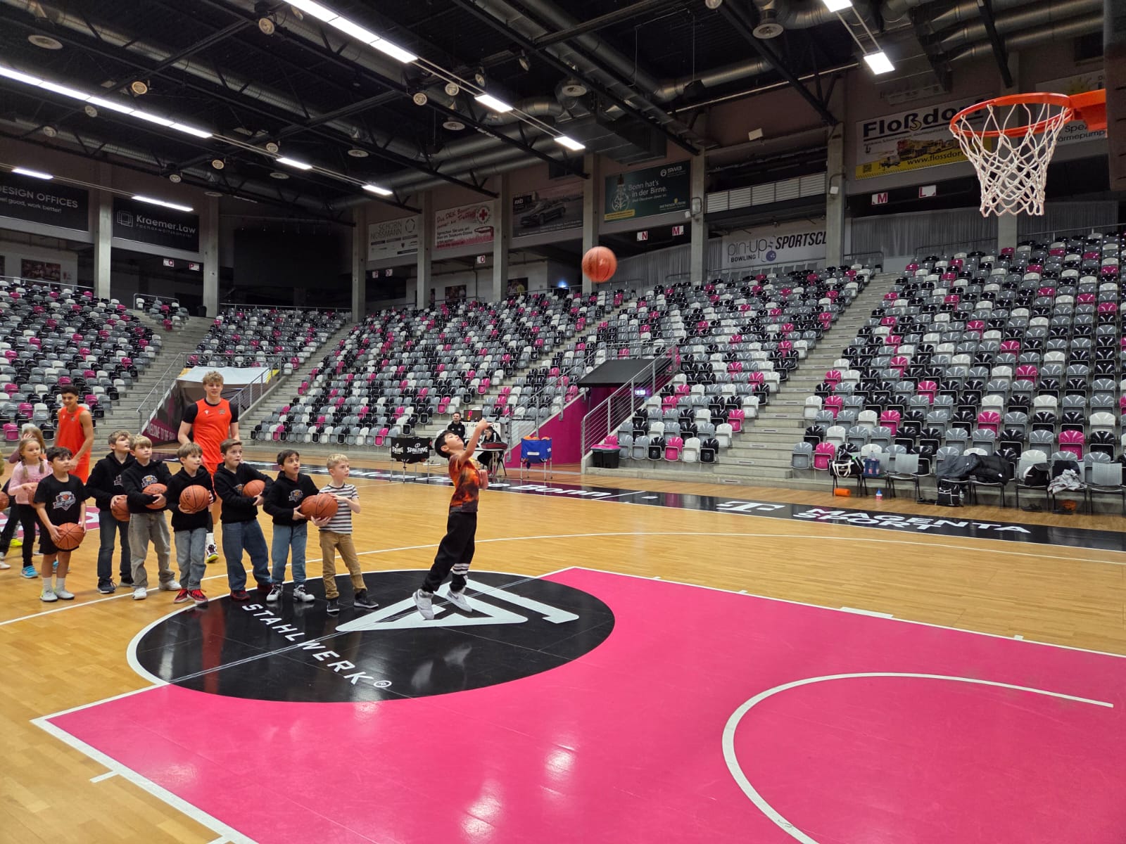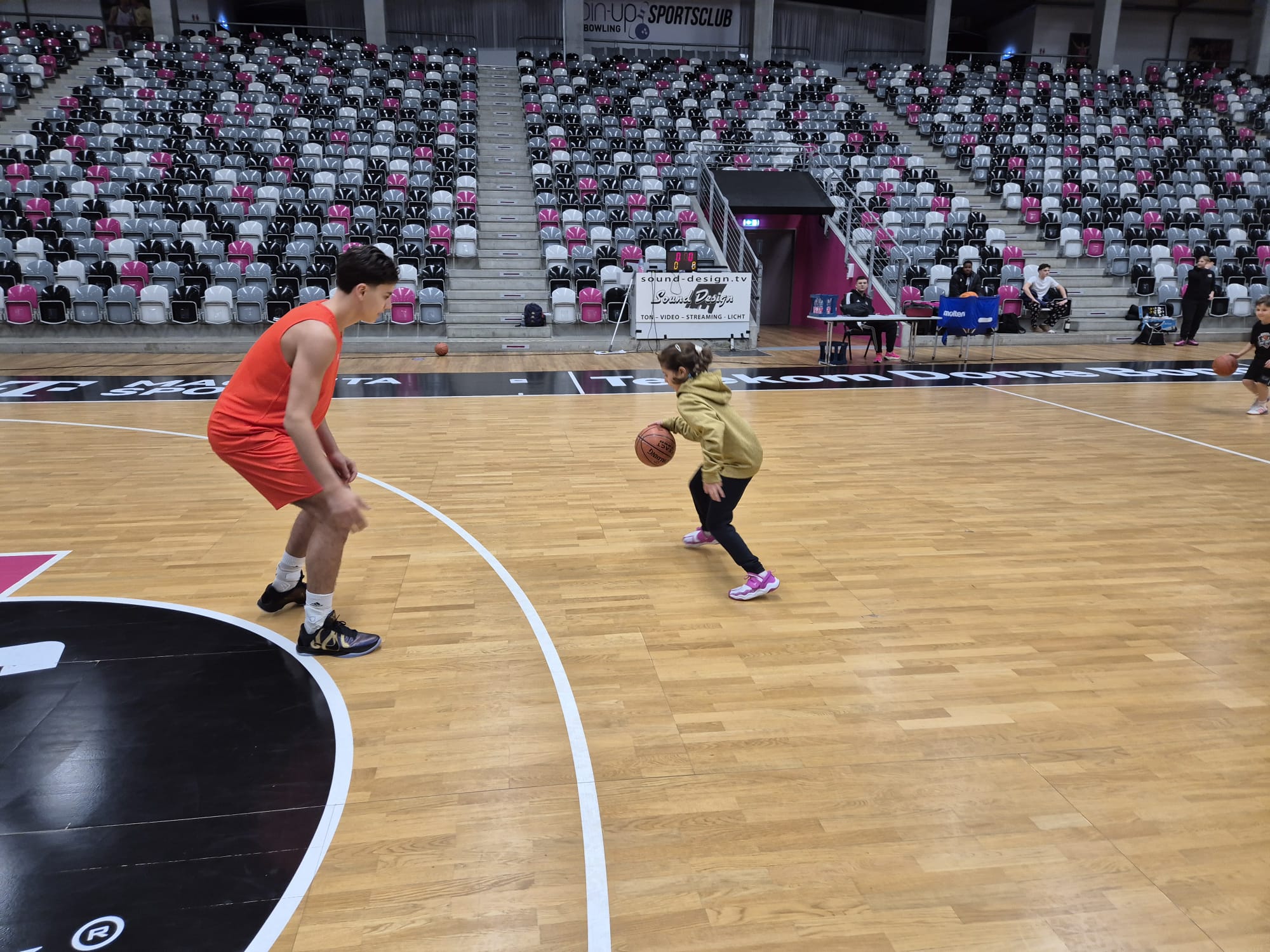 Das absolute Highlight folgte im Telekom Dome selbst: Auf dem Court der Profis zogen die Kinder ihre Basketballschuhe an und durften sich gemeinsam mit drei NBBL-Spielern messen. Im Anschluss verfolgten sie das Training der NBBL-Spieler und erlebten hautnah das Tempo und die Intensität auf höchstem Nachwuchsniveau.