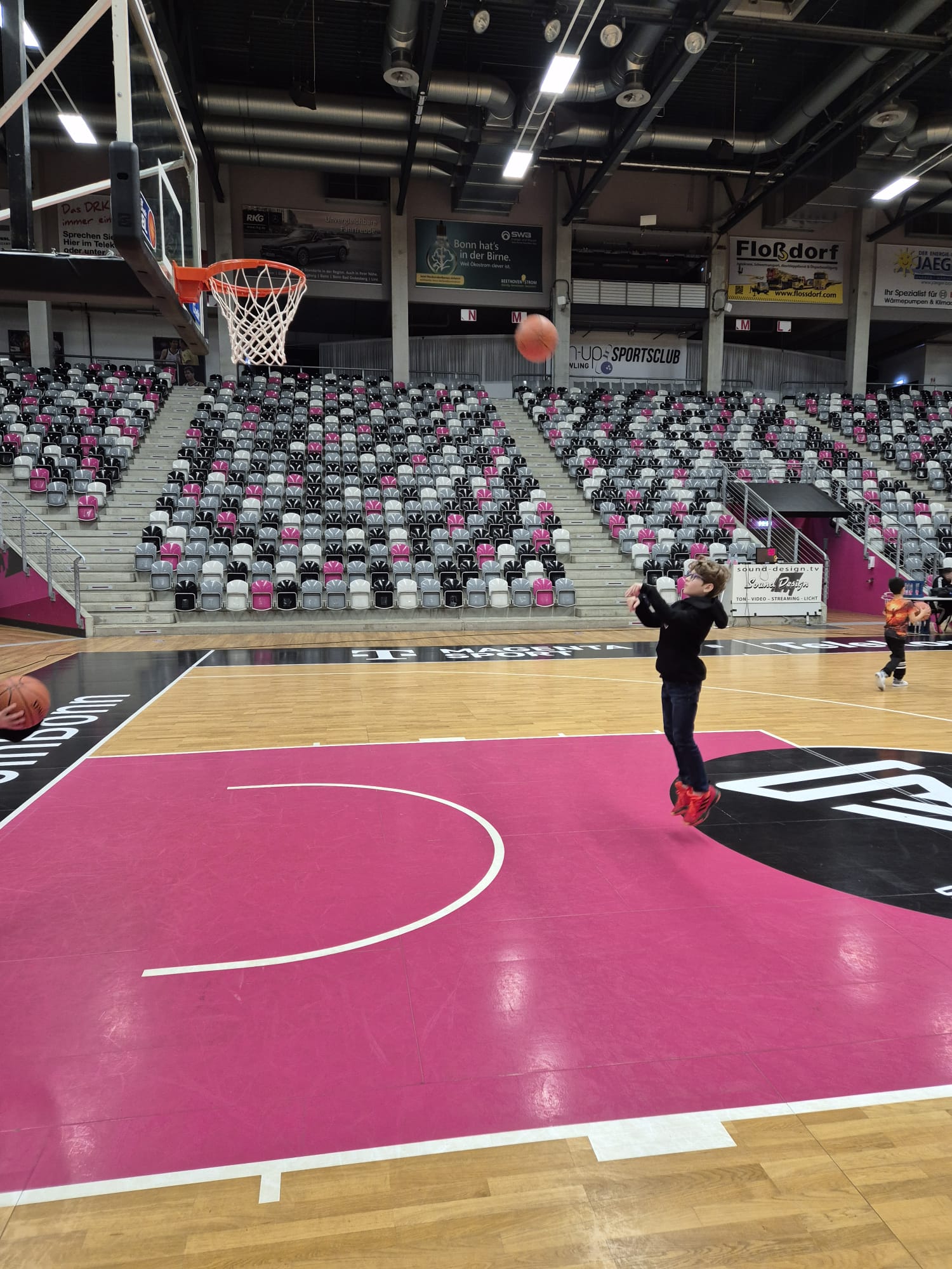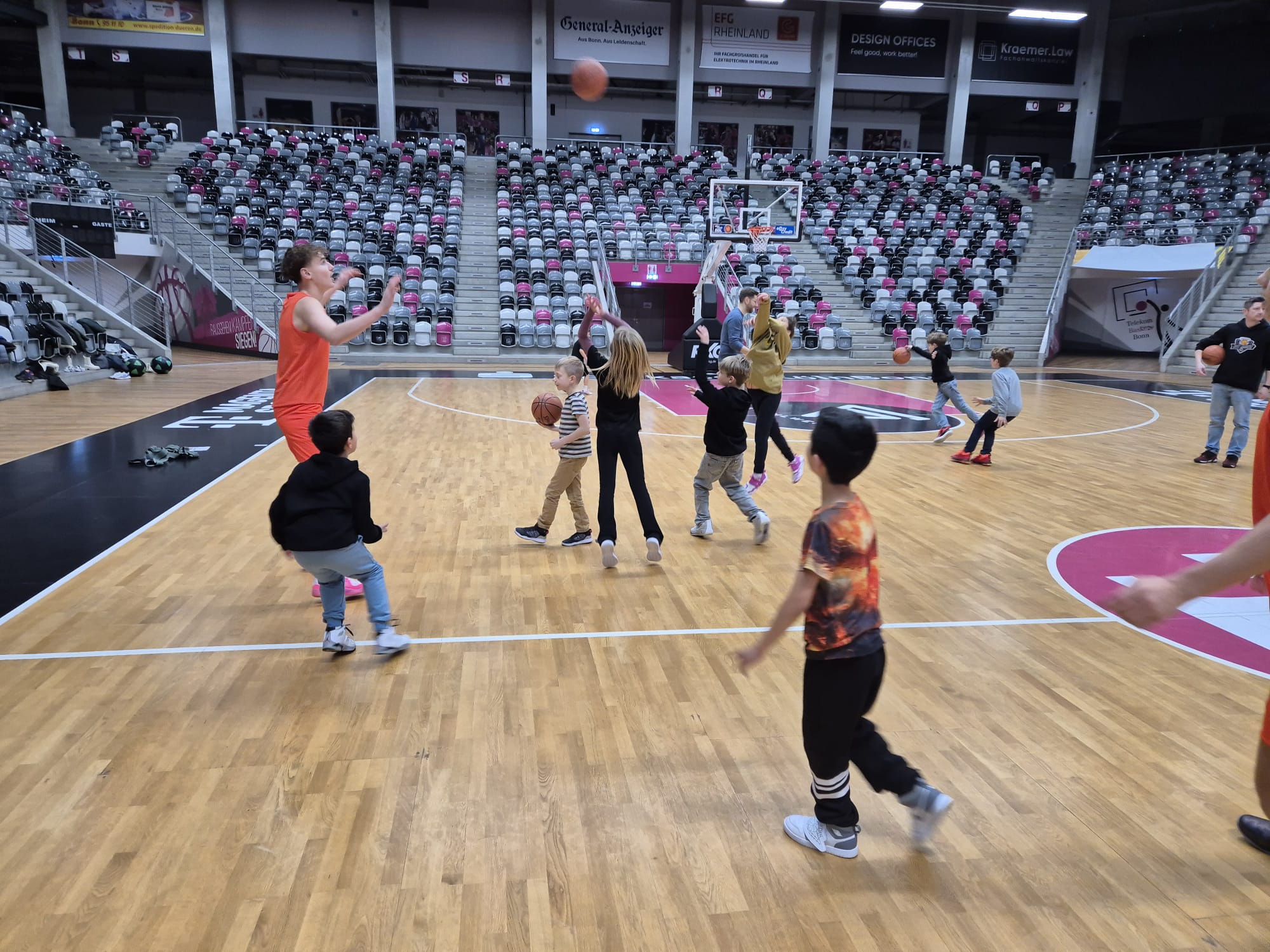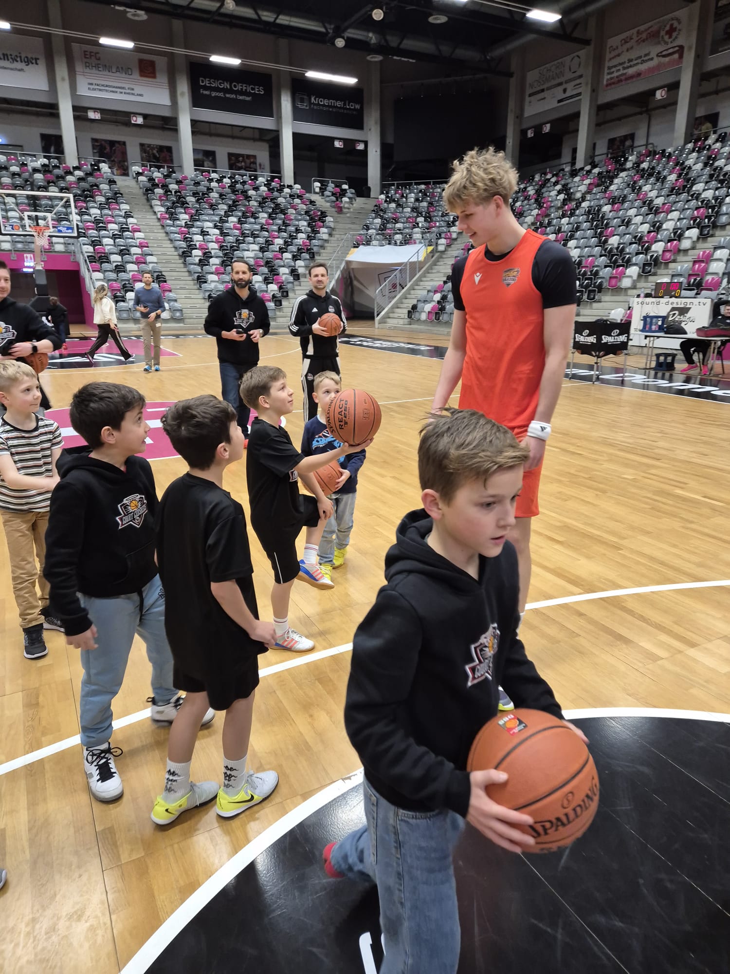 Das absolute Highlight folgte im Telekom Dome selbst: Auf dem Court der Profis zogen die Kinder ihre Basketballschuhe an und durften sich gemeinsam mit drei NBBL-Spielern messen. Im Anschluss verfolgten sie das Training der NBBL-Spieler und erlebten hautnah das Tempo und die Intensität auf höchstem Nachwuchsniveau.